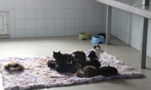 Przechodzę do sąsiedniego budynku. Wita mnie tutaj rząd przeszklonych drzwi, przez które mogę zaobserwować zupełnie odmienne reakcje niż te, które miały miejsce przy boksach. Koty wydają się być na pozór obojętne na swój los. W dość dużych pomieszczeniach przebywa ich, na oko, po kilkanaście, ale miejsca jest na tyle dużo, by każdy mógł funkcjonować tak jak chce. Większość czasu spędzają śpiąc zwinięte w kłębek – te bardziej towarzyskie łączą się i zasypiają przytulone, te mniej – znajdują własne, odosobnione miejsce. Niektóre siedzą na środku w zwartej grupie, tuląc się do siebie, a widząc zainteresowanie człowieka unoszą zaspane pyszczki i tylko zerkają na nas swoimi na pozór obojętnymi oczami. Wydawałoby się, że w schroniskowej rzeczywistości powinno być im łatwiej niż pozostałym podopiecznym, chociażby biorąc pod uwagę ich usposobienie i koci charakter. No właśnie – wydawałoby się, ale czy tak jest?